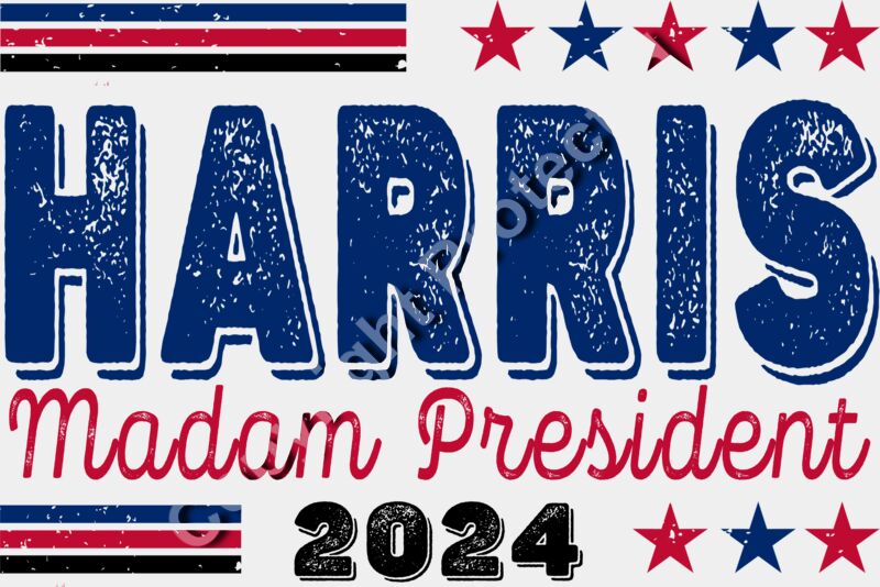 Kamala Harris 2024 campaign slogan with red and blue stars and bold typography harris madam pre