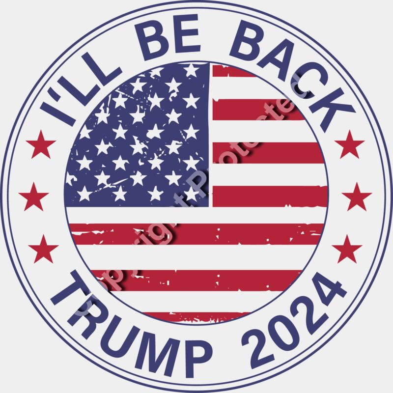 Trump 2024 campaign emblem with American flag and slogan I ll Be Back