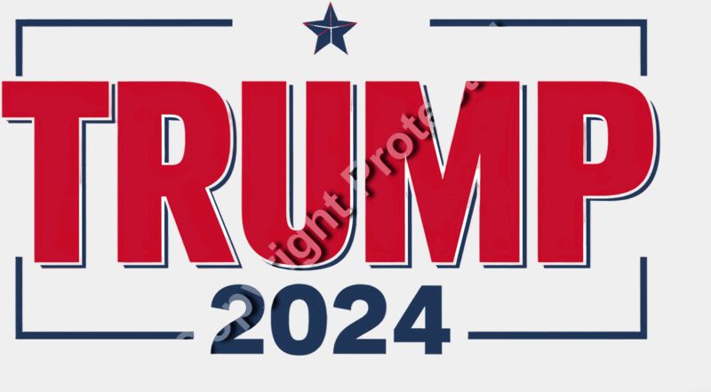 Trump 2024 campaign graphic with bold red text and blue accents featuring a star above the text