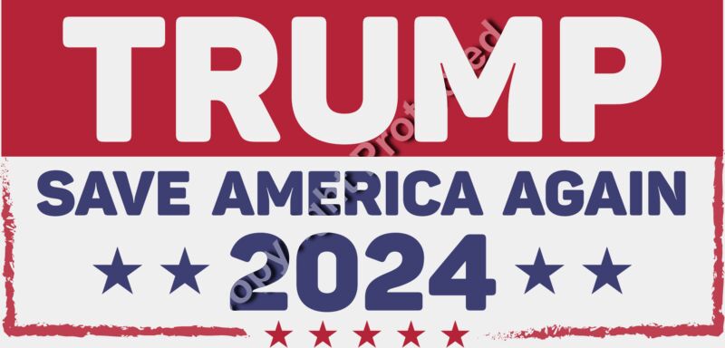 Trump 2024 campaign slogan Save America Again with red white and blue colors and stars