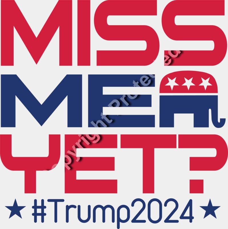 Trump 2024 election slogan graphic featuring MISS ME YET in bold red and blue colors with an ele